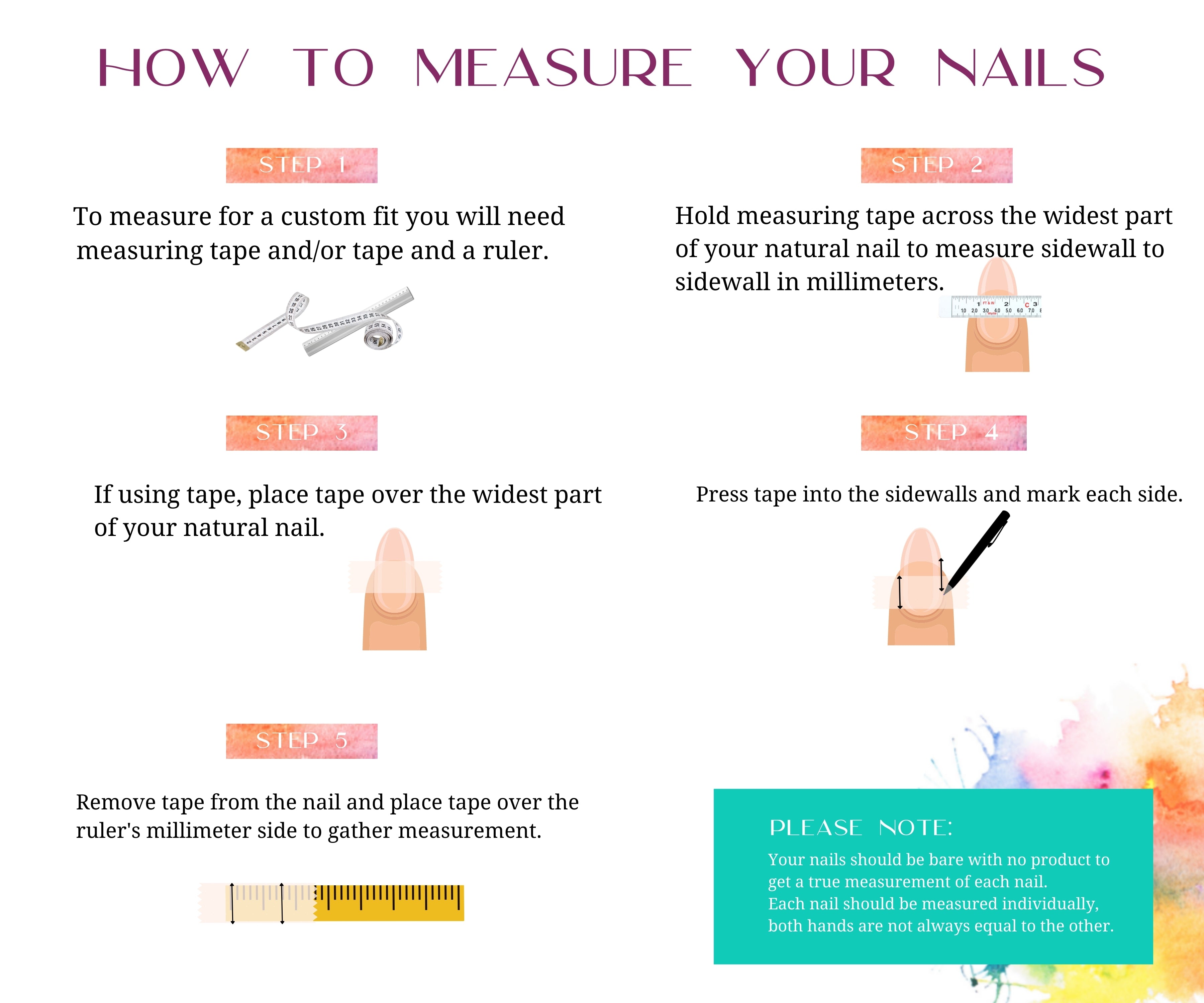 2.) Hold measuring tape across the widest part of your natural nail to measure sidewall to sidewall in millimeters.